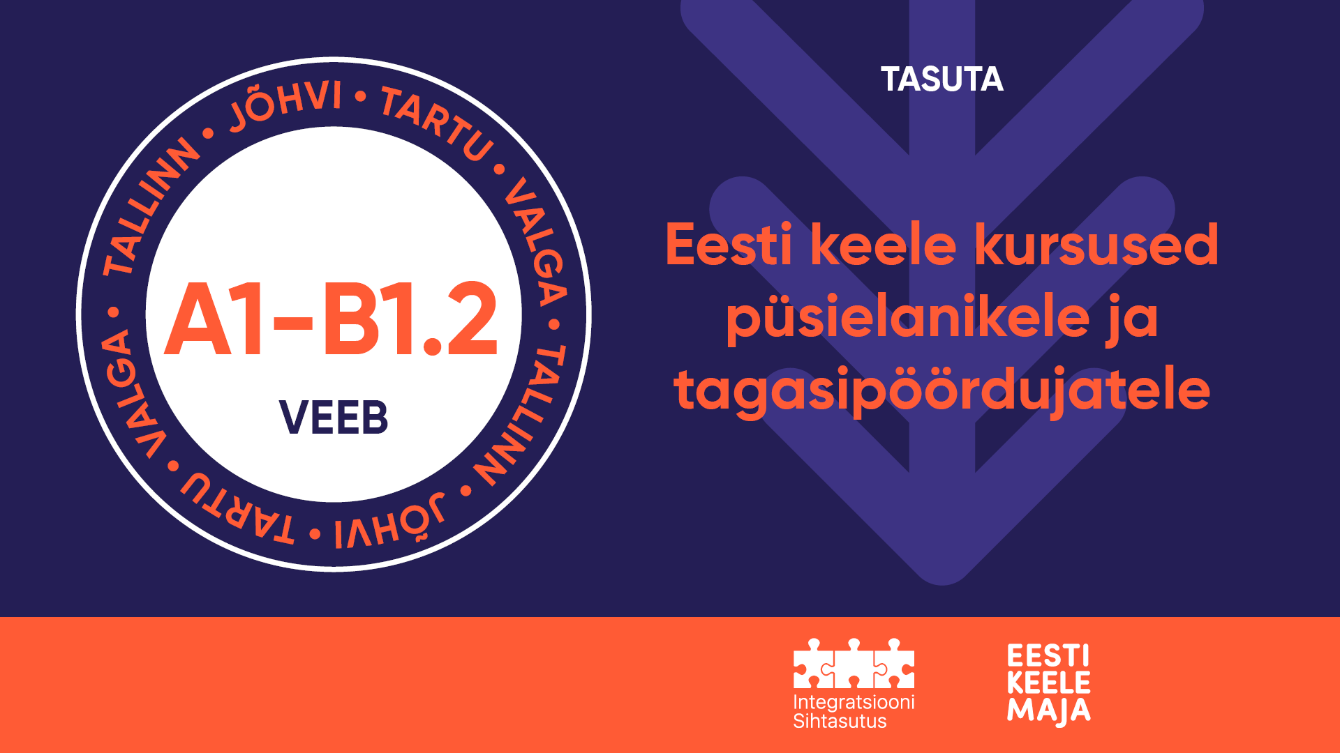 0123 KIIRELT LEITAV Leia vastus küsimusele Eesti keele ja kultuuri huvilisele Eestisse tulijale Eesti inimestele üle maailma Eesti kodakondsuse taotlejale Rahvuskultuuriseltsidele Tööandjatele Tule meile ärianalüütikuks 19.09.2025 #meeskond Rahvuste päeva tähistatakse tänavu kontsertide, laatade ja töötubadega üle Eesti 17.09.2025 #kultuuriline mitmekesisus Integratsiooni Sihtasutus kutsub kodakondsuse huvilisi infotundidesse 11.09.2025 #pressiteade Alustavad haridusprogrammid „Eesti raamat 500“ 03.09.2025 september 2025 1 2 3 4 5 6 7 8 9 10 11 12 13 14 15 16 17 18 19 20 21 22 23 24 25 26 27 28 29 30 1 2 3 4 5 Pagination Prev Next 01.10.2025 Matsalu loodusfilmide festivali (MAFF) õhtu Narva eesti keele majas 04.10.2025 Narva - Tartu õppereis 2025 - KOHAD TÄIS 06.10.2025 Mokalaat B2 (Zoom) NÕUANDEVEEB Integratsiooni uudiskiri Sisesta oma e-mail LIITU Jälgi meid sotsiaalmeedias! #integratsioon Loe teisi uudiseid › Uudised Tule meile ärianalüütikuks 19.09.2025 #meeskond Narvas toimus uue eesti keele õppevahendi, kunstikaartide „Silmitsi kunstiga“, esitlus 18.09.2025 Rahvuste päeva tähistatakse tänavu kontsertide, laatade ja töötubadega üle Eesti 17.09.2025 #kultuuriline mitmekesisus Rahvuste päev 2025 17.09.2025