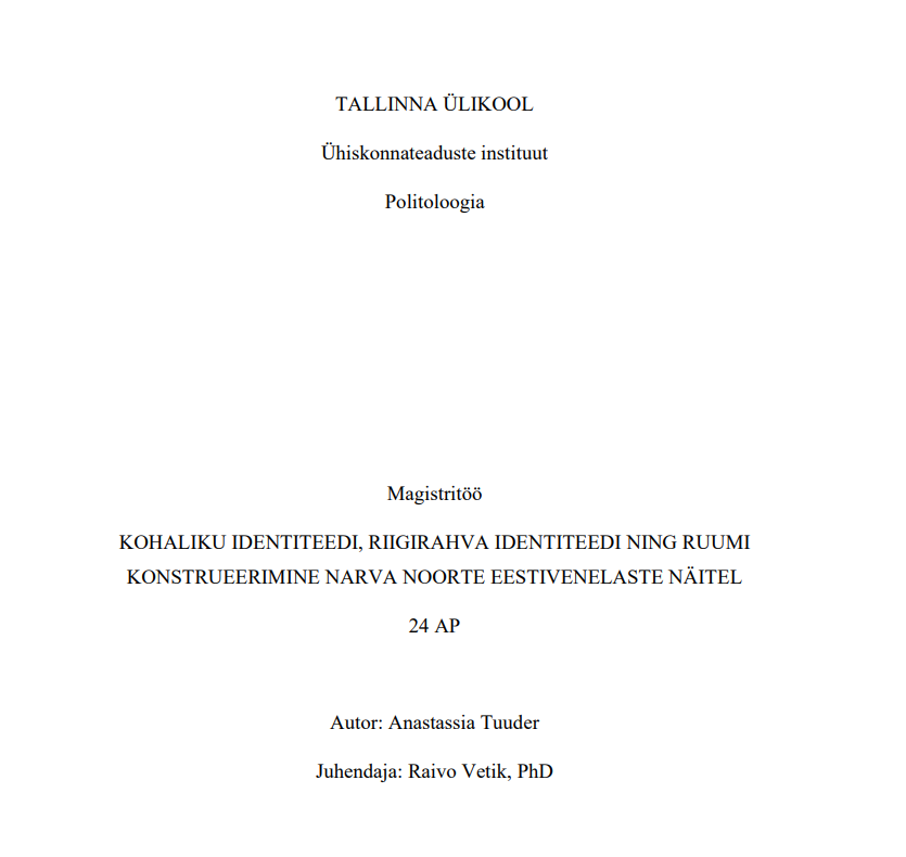 Anastassia Tuuder'i magistritöö eesmärk oli teada saada, kuidas Narva noored konstrueerivad kohalikku ja riigirahva identiteeti, kuidas see suhestub domineeriva ja domineeritava subjektipositsiooniga ning kuidas läbi ruumi konstrueerimise ja ruumi mõju inimestele on võimalik vaadelda kohalikku ja riigirahva identiteeti ning positsioneerimist Eesti ja Narva kontekstis.